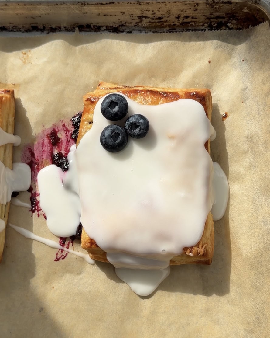 Rough Puff Pastry 0 Add ice into a cup of water and set aside. 3 In a medium mixing bowl, whisk together the flour, salt, and sugar with a fork. 2 Thinly slice the cold butter, dropping it into the dry ingredients as you do. The slices should be between 1/8th and 1/4 of an inch thick. 4 I like to use a pairing knife and cut directly off a big Kerrygold block but you can also pre slice the butter on a cutting board if you prefer. Just make sure the butter stays cold. 5 Smush each slice of butter between your fingers into the dry ingredients to flatten them out and start working in the flour mixture. 6 Drizzle the ice water onto the surface of everything in the bowl. 7 Use a fork to mix and slightly smush the water into the mixture until it looks shaggy. It’s ok if it still looks a little dry but there shouldn’t be large amounts of completely dry flour left. Don’t be tempted to add more water. 8 Pour the mixture onto a sheet of plastic wrap and use the sides of the plastic wrap to smush the dough into a square that’s between 1/2″ and 1″ thick. 9 Place the dough in the fridge to chill for 45 minutes. 10 After 45 minutes, dust your work surface with flour. Take the pie dough out of the fridge and roll the dough out in a rectangle that is about 1/4″ thick. Use flour and a bench scraper as needed to keep the dough moving and keep it from sticking. 11 Letter fold the dough so fold the top third over the middle third, and then the bottom third over the other two thirds. 12 Rotate the dough 90 degrees and roll the dough back out to 1/4″ thick. Repeat the letter folds, it should be a skinny long rectangle so when you fold it you will have a square. 13 Rewrap the dough and chill for another 45 minutes. 14 After the 45 minutes have passed repeat the above steps of rolling and folding the dough twice. Rewrap the dough and chill for another 45 minutes. At this point you can chill it for as long as you need until you’re ready to use it. 15 If chilling for more than 6 hours, place it in a ziptop bag to make sure it doesn’t dry out. Lemon Blueberry Filling 17 Add the blueberries, 25 grams of sugar, lemon zest, and the juice of one lemon to a sauce pot. 18 Place the pot over medium low heat and wait until it starts to bubble. Then stir frequently and continue to cook until all of the blueberries have broken down but it's still quite saucy. Allow to reduce for another 5-10 minutes. 19 In a separate bowl stir together the corn starch and 25 more grams of sugar. Add in the juice of half a lemon (more as needed to make a sauce like texture) and stir to combine. 20 While stirring the blueberries, pour in the corn starch mixture. Stir and cook for another 3-5 minutes until it has visibly thickened. 21 Remove the pot from the heat and pour the blueberry compote into a shallow dish or baking sheet to allow it to cool completely. Cover the surface with a sheet of plastic wrap to keep if from forming a skin. 22 Once cooled, move it to the fridge for at least 30 minutes. 23 Make sure it's cold before using for the filling of the puff pastry. Assemble and Bake 25 Preheat the oven to 400 F and place a rack in the center of the oven. 26 Line a baking sheet, with a sheet of parchment paper. 27 Make the egg wash by whisking the egg with two tablespoons of water and a sprinkle of salt in a small bowl. 28 If using the homemade ruff puff, use flour as needed to roll the pastry as thin as you can. If using store bought, just give it a quick roll out so that it's smooth and flat. For the homemade pastry you'll want it to measure about 16" x 10" (slightly larger is better). 29 Trim off any scraggly edges and then cut the rectangle into 8 even rectangles. 30 On four of them, spoon 3-4 tablespoons of the chilled blueberry filling into the center. 31 Brush the edges of the rectangles with the filling, with the egg wash. Lay the top set of rectangles over the top of the bottom set. You have to slightly stretch each rectangle to fit it over the pile of filling. 32 Press the edges of the two sheets of pastry together with your fingers first. Then use a fork to crimp the edges together so they are fully sealed. 33 Use the same fork to prick the top of each pastry rectangle three times so that steam can escape. At this point I like to put them into the freezer for 10-15 minutes so you can put them on anything that'll fit in your freezer, just make sure to line it with parchment so they don't stick. 34 After the time in the freezer, evenly space the pastries on the original parchment lined baking sheet. Brush the top of the pastries with more egg wash. 35 Bake the pastry in the preheated oven for 15 minutes, then rotate and bake for another 10-15 minutes until deeply golden brown. 36 Once baked, remove the sheet from the oven and place on a wire rack to cool for 10-15 minutes minimum. Lemon Glaze 38 In a small bowl whisk together the powdered sugar and lemon juice into a glaze. It should be the consistency of a creamy peanut butter or a thick honey. Add more powdered sugar or lemon juice as needed to thicken or loosen the glaze respectively. 39 Once cooled, spoon or drizzle the tops of the pastries with the glaze. Optionally decorate with a few more fresh blueberries. 40 These are best fresh but they will keep for a day or two at room temperature in an airtight container.View original recipe