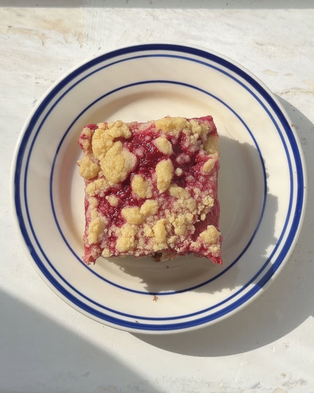 Rhubarb Compote 0 Rinse and chop the ends off of the rhubarb stalks. Chop the rhubarb into 1″ chunks and add them into a medium pot. 2 Pour in the sugar and then add in the water. 3 Place over medium low heat and cover with a lid. Cook covered for about 5 minutes or until the mixture starts to bubble. The lid on will keep the rhubarb from burning. 4 Once it starts to bubble, remove the lid and continue to cook, for about 10 minutes until you are left with a thick syrupy type of sauce. 5 Pour the compote into a large shallow bowl and leave to cool to room temperature. Use same day or store covered in the fridge until you’re ready to use it. Streusel 7 In a medium bowl add in the soft butter, sugar, salt and vanilla. Use a fork to stir together until smooth. 8 Pour in the flour and use the fork to rub the flour into the butter mixture until fully combined. Cake Batter 10 Preheat the oven to 350 F and place a rack in the center. 11 In a medium bowl add in the sugar and lemon zest, rub the zest into sugar until fragrant. Then add in the flour, baking soda, baking powder, and salt and whisk to combine. 12 Add in the butter, sour cream, eggs, and vanilla. 13 Use a mixer to mix the ingredients first on medium low until 90% combined. 14 Use a flat rubber spatula scrape the bottom and edges of the bowl and finish mixing the wet and dry ingredients together. 15 If not using a non-stick pan, spray the cake pan with your baking spray and line with a rectangle of parchment that is 15" x 8" from one side to another. Pour in the cake batter. 16 Smooth out the cake with a rubber spatula. Assemble and Bake 18 Pour the fresh or frozen raspberries over the surface of the cake in an even layer. Feel free to press them in slightly to the cake. 19 Then spoon the cooled rhubarb compote over the raspberries and spread it into an even layer. 20 Clump the streusel and sprinkle it over the fruit layer. 21 Place the cake into the preheated oven and bake for 30 minutes. Rotate the cake 180 degrees and bake for 30 more minutes. 22 The cake will be done when the streusel is golden brown and the cake only has a very slight or no wobble. 23 Once baked, remove from the oven and leave to cool for at least 15-20 minutes on a wire rack. Run a knife along the edge between the cake and the pan. Then either lift the cake out with the parchment or slice the cake while it's still in the pan.View original recipe
